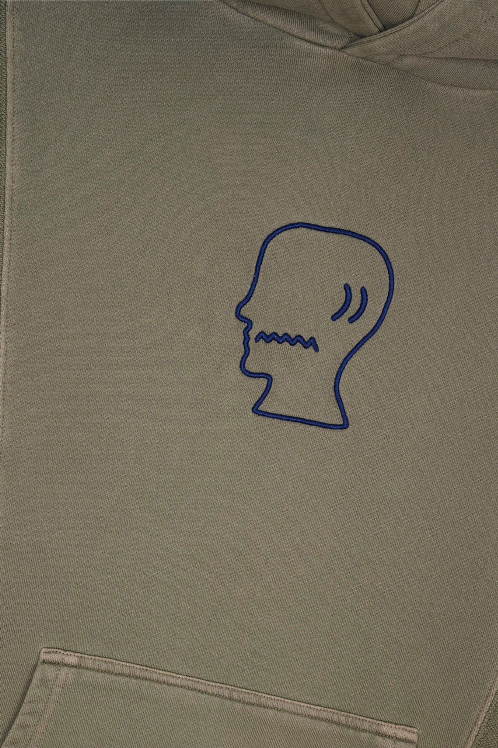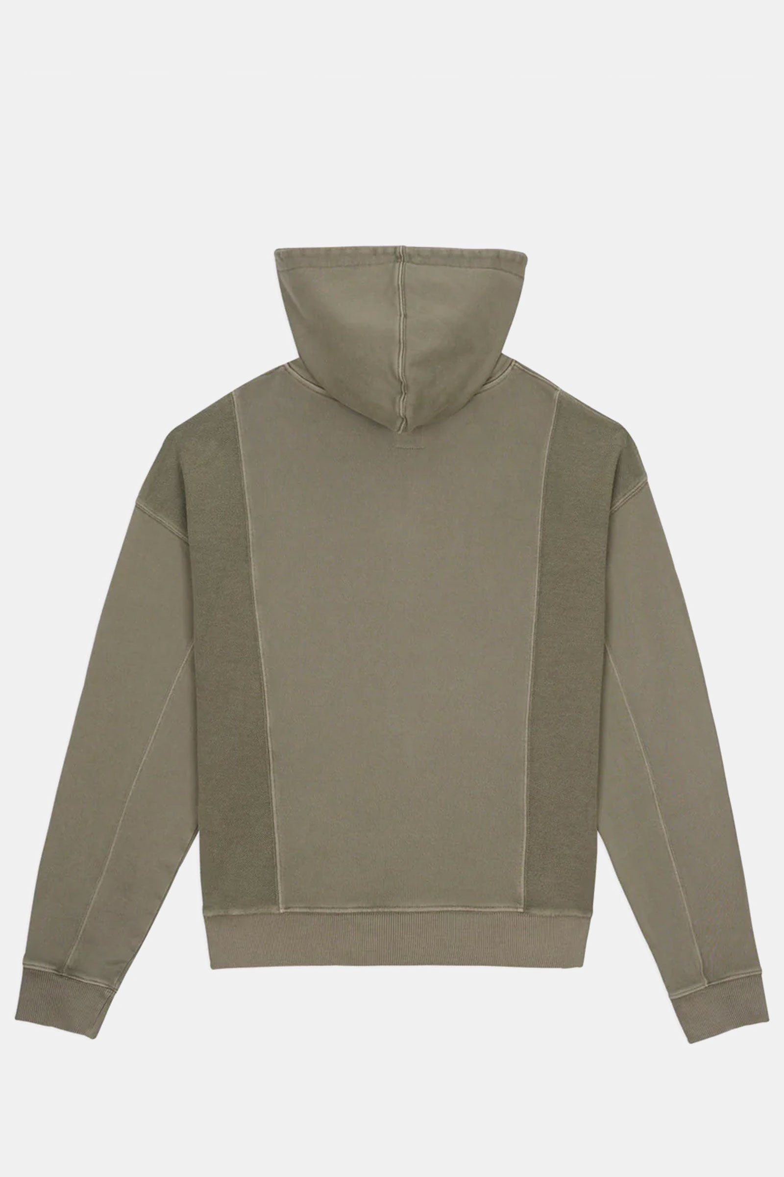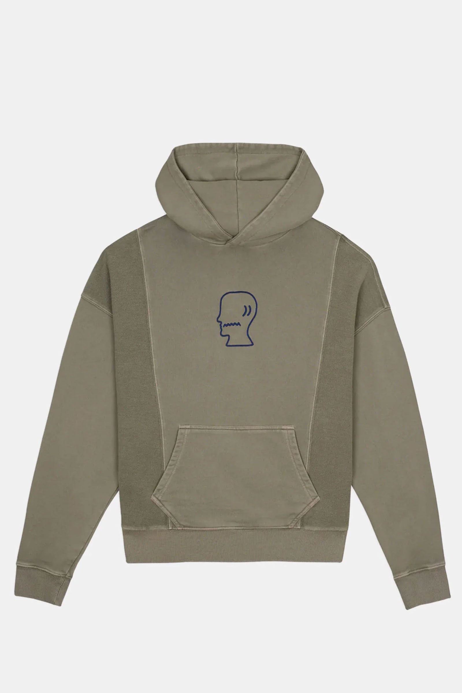 standard hoodie with 3D embroidered Brain Dead Logohead at center front. Paneled bodice alternates front and reverse French Terry for tonal texture. Finished with tapered kangaroo pocket, roomy hood, and ribbed trims.