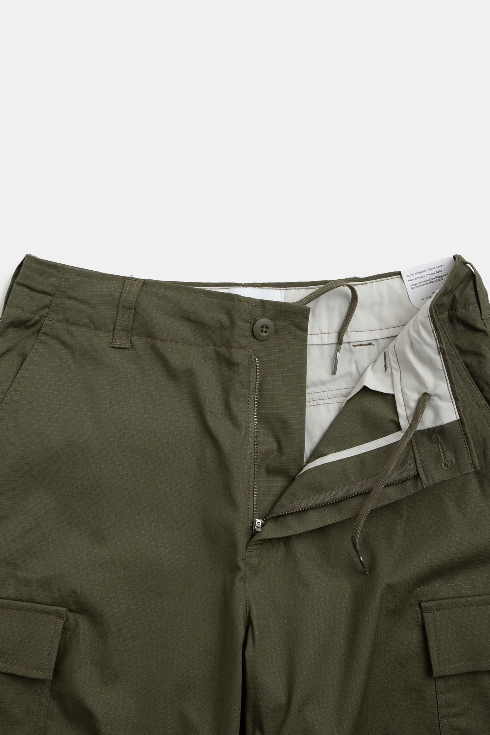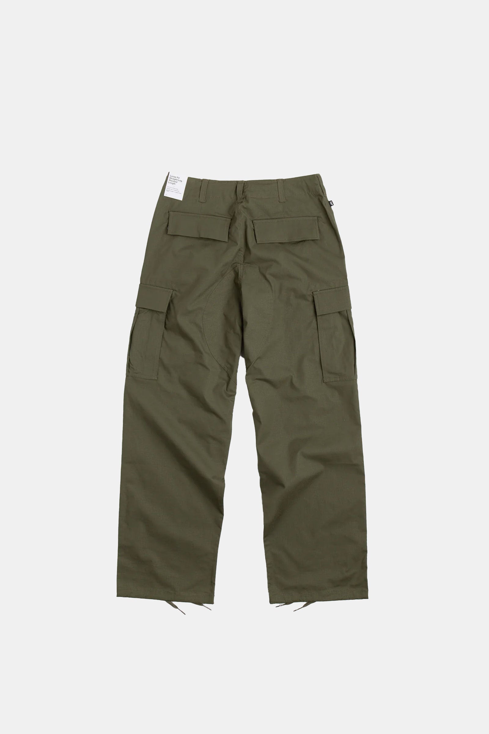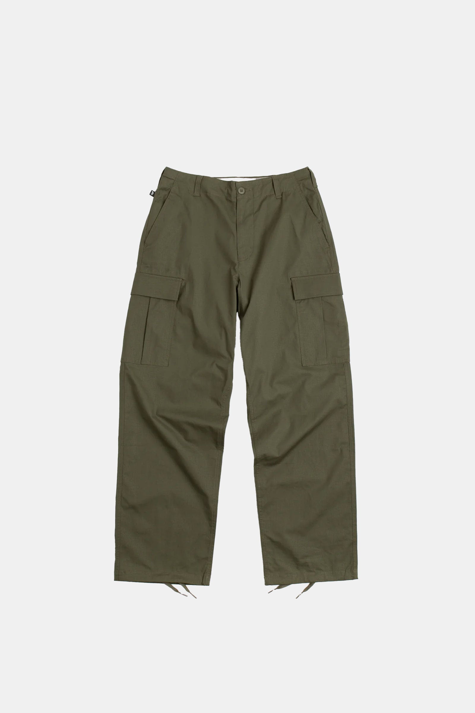 Nike SB Kearny Cargo Pants in Medium Olive. Tailored to a regular fitting from a cotton-spandex ripstop blend, these tapered leg Nike SB cargo pants are utility inspired with a reinforced seat. Featuring a belt loop waistband, tonal stitched seams and a single button secured zipper fly, these Nike SB pants are finished with four classic pockets, additional cargo pockets and with woven flag label branding.Â