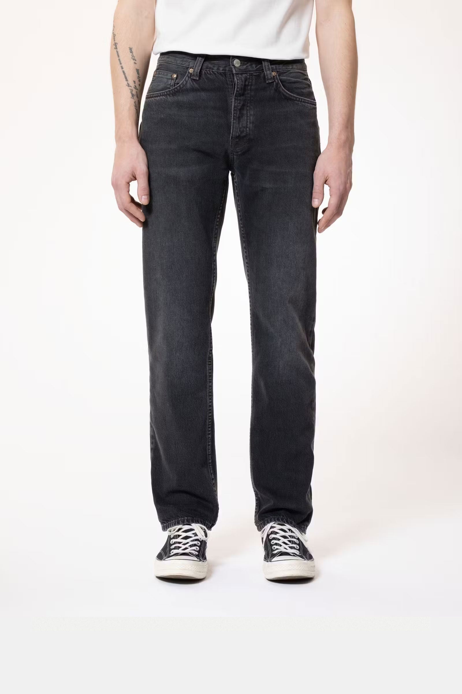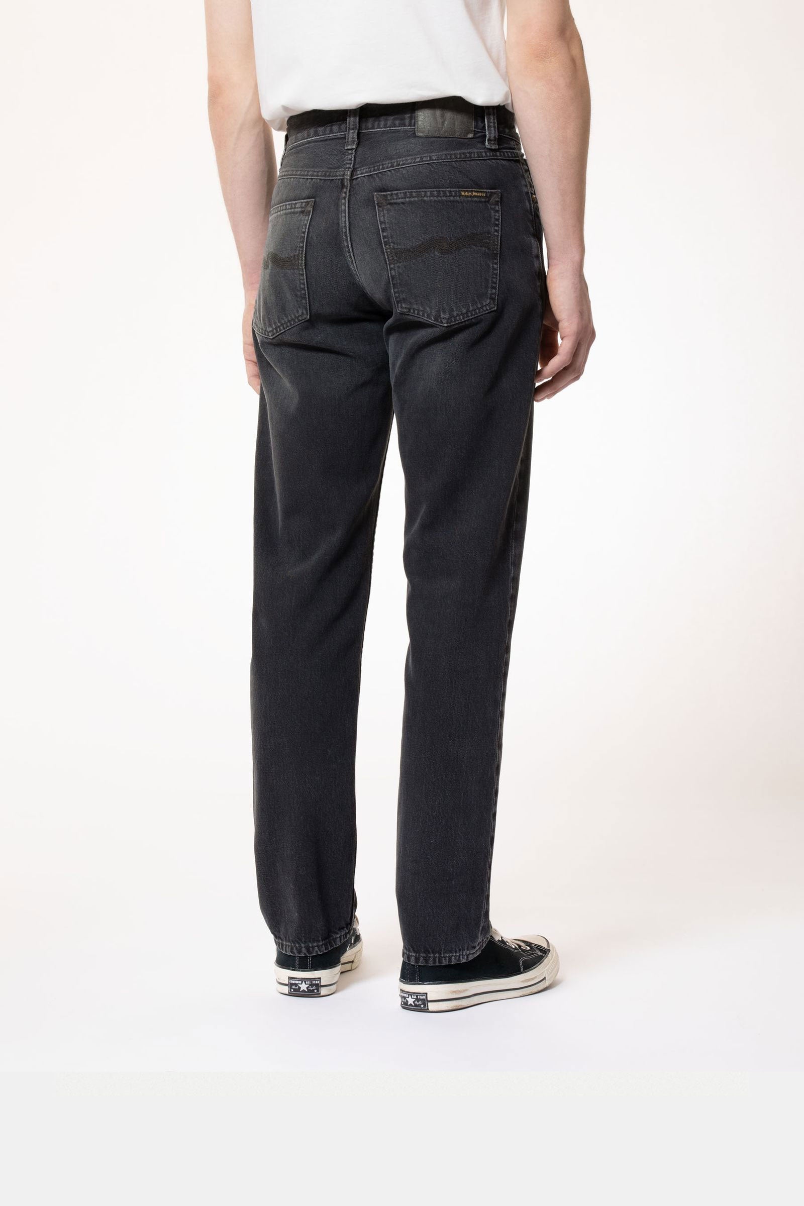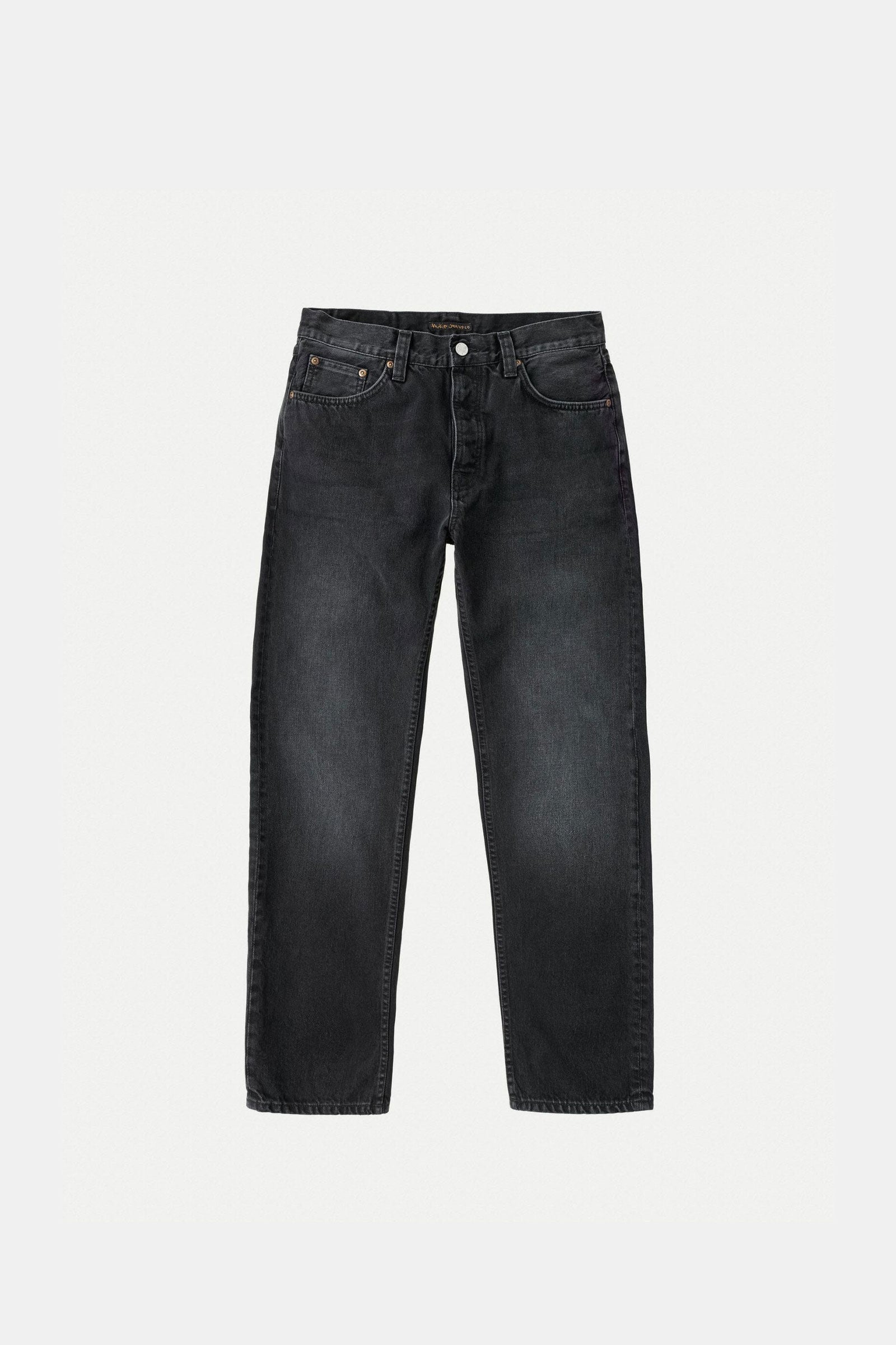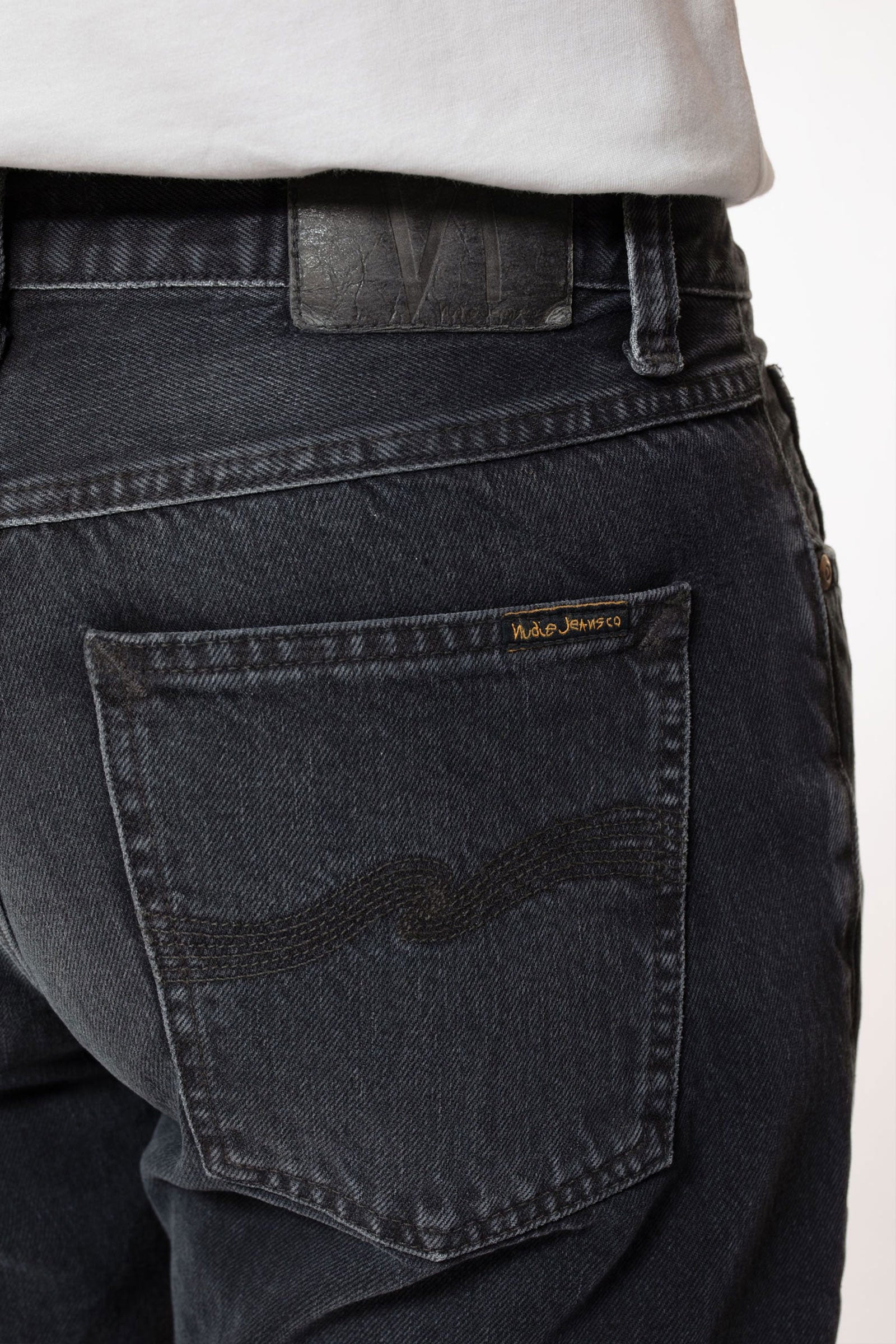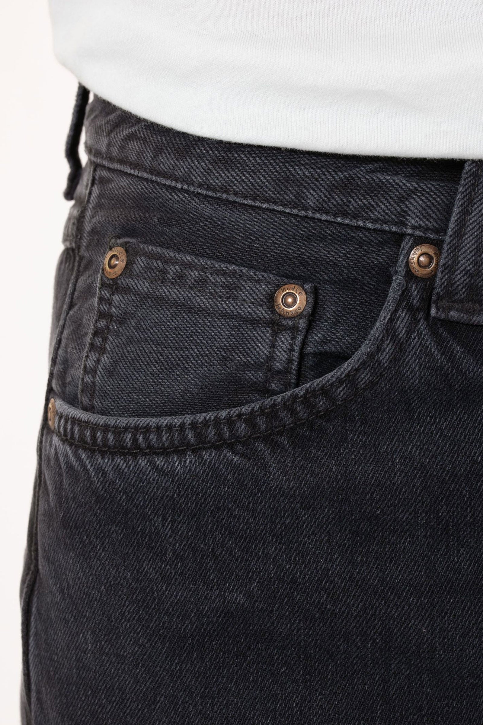 Regular fit jeans with a straight leg made in our favorite Italian black denim. These jeans have been treated with a smooth vintage-like wash that showcases a span of textures, a muted yet rich marbling texture upon which the abraded areas add a flat texture with clear twill lines. In short; a perfectly smooth, jaw-dropping, vintage wash.