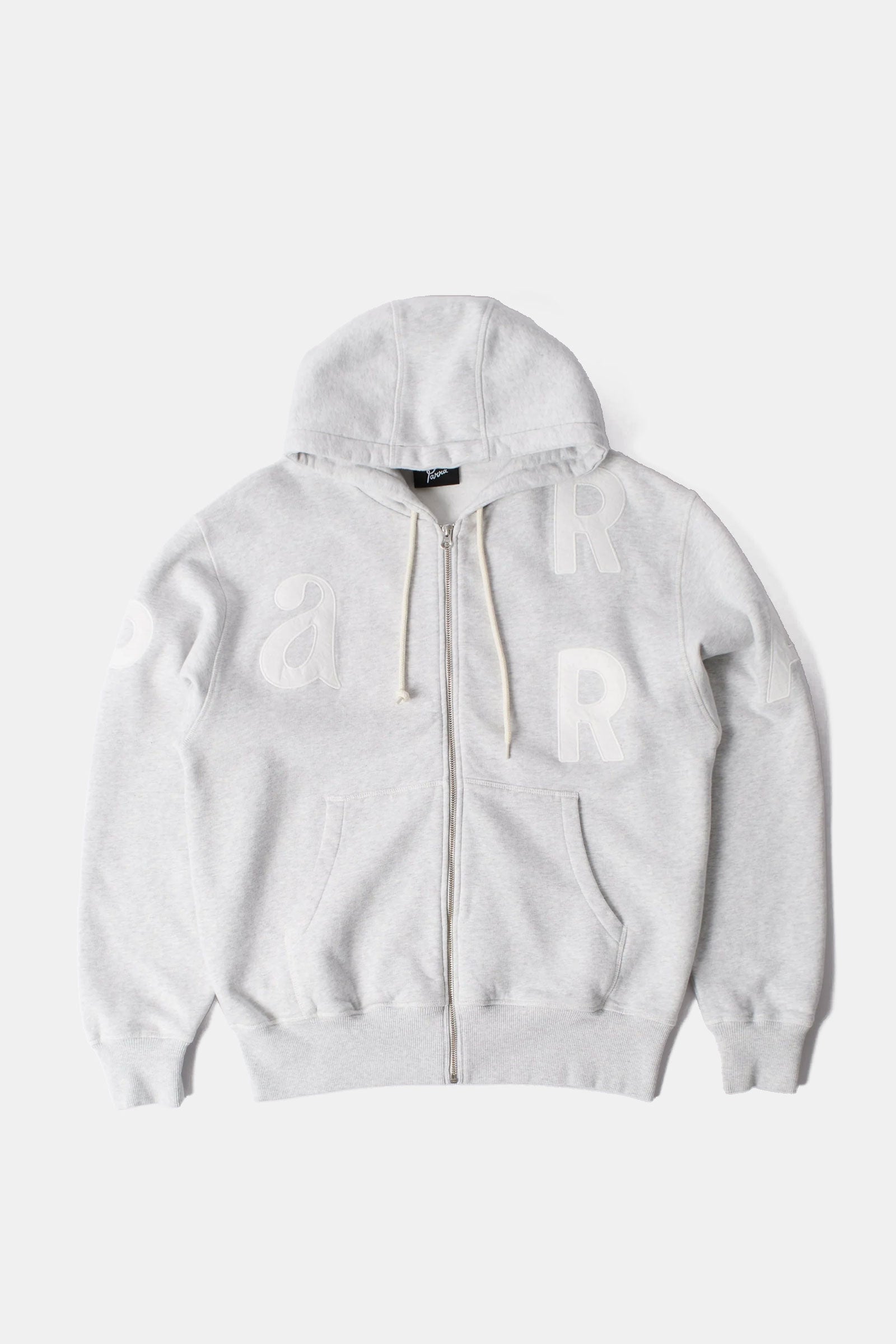 Zipper hoodie with appliqué lettering on the chest and sleeves. Made from extra heavy 100% cotton that's brushed on the inside for extra softness.